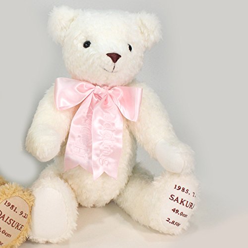 クマの表情が優しいウェイトベアです。片足だけにお名前が入ったタイプで、白いタイプは女の子におすすめ。首のリボンも太く存在感があり、同色の刺繍が入っていて素敵です。