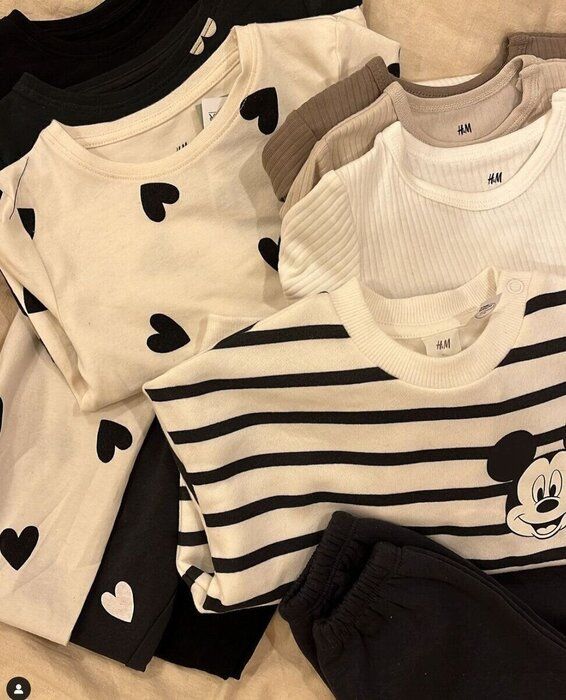 KAHOさんは、こちらのアイテムをH&Мにてゲット。肌着はずっと愛用しているようで、サイズアップ︎したものを購入したんだとか。ハートのセットアップは見つけた瞬間に一目ぼれしたそう。くすみカラーとモノトーンカラー、どちらも使えますよね。