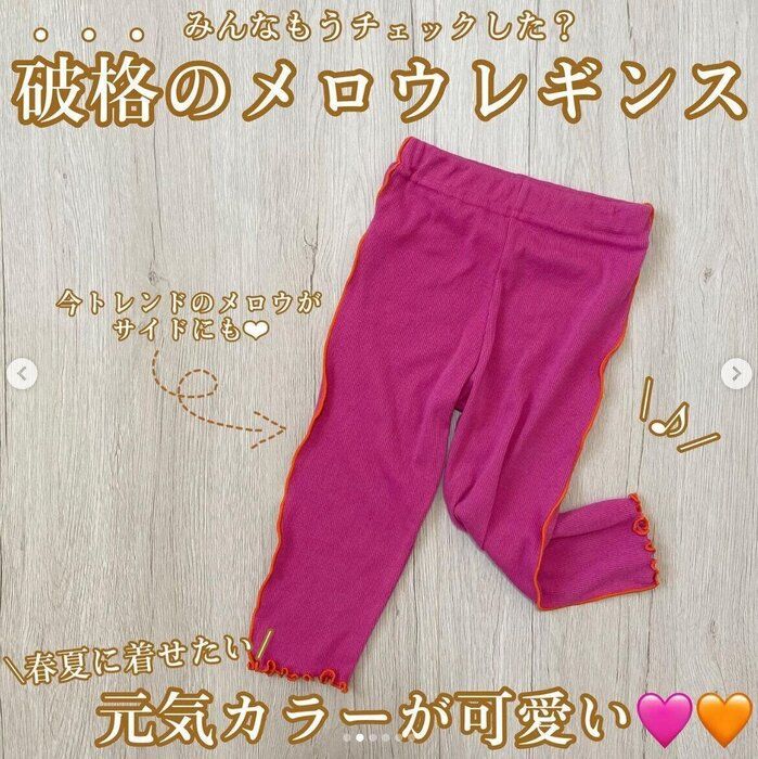 koro.mom_bbさんがゲットしたのは、しまむらの9分丈レギンス。大流行しているメロウのデザインで、トレンドライクな着こなしがしたい人におすすめ!ピンク×オレンジの組み合わせが夏っぽくてかわいいですよね♪ ストレッチ性のあるレギンスなので、これからの時期の外遊びにもぴったりです。「ビビッドカラーが似合うか不安」という人も、顔から離れているボトムスならチャレンジしやすいのでは?