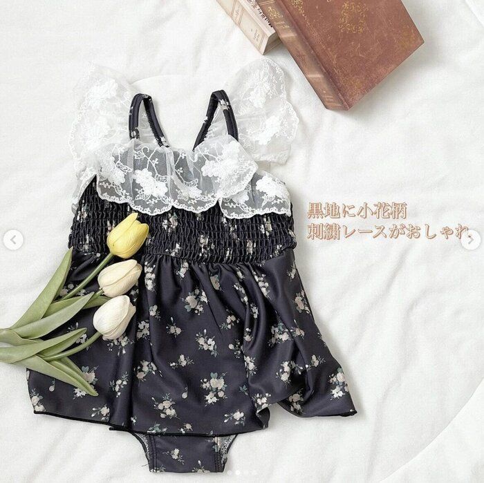 こちらはchocobaby.10さんが西松屋で購入した、1,967円のワンピース水着。黒地×花柄のデザインや、肩まわりに付けられたレースがオシャレで気に入っているんだそう♪ 大人っぽい水着を探している人にぴったりですね♪