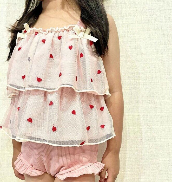 Hitomiさんは、こちらの水着をしまむらにてゲット。生地も柔らかくてチュールも可愛いとお気に入りなんだとか。セパレートっぽいですが、ワンピースタイプの水着のようですよ。ハートがふんだんに刺しゅうされており、可愛らしいですね。