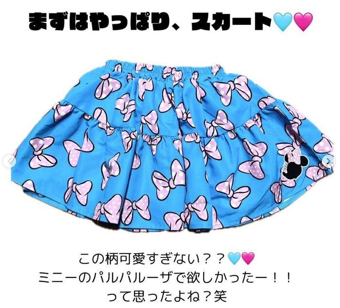 こちらはyaaaayo_friendsさんが購入した、ミニーマウスのスカート。スカートにはミニーマウスのシルエットが刺しゅうされており、高見えするんだそう!インナーパンツもついており、安心してはけるのも嬉しいポイントですよね◎