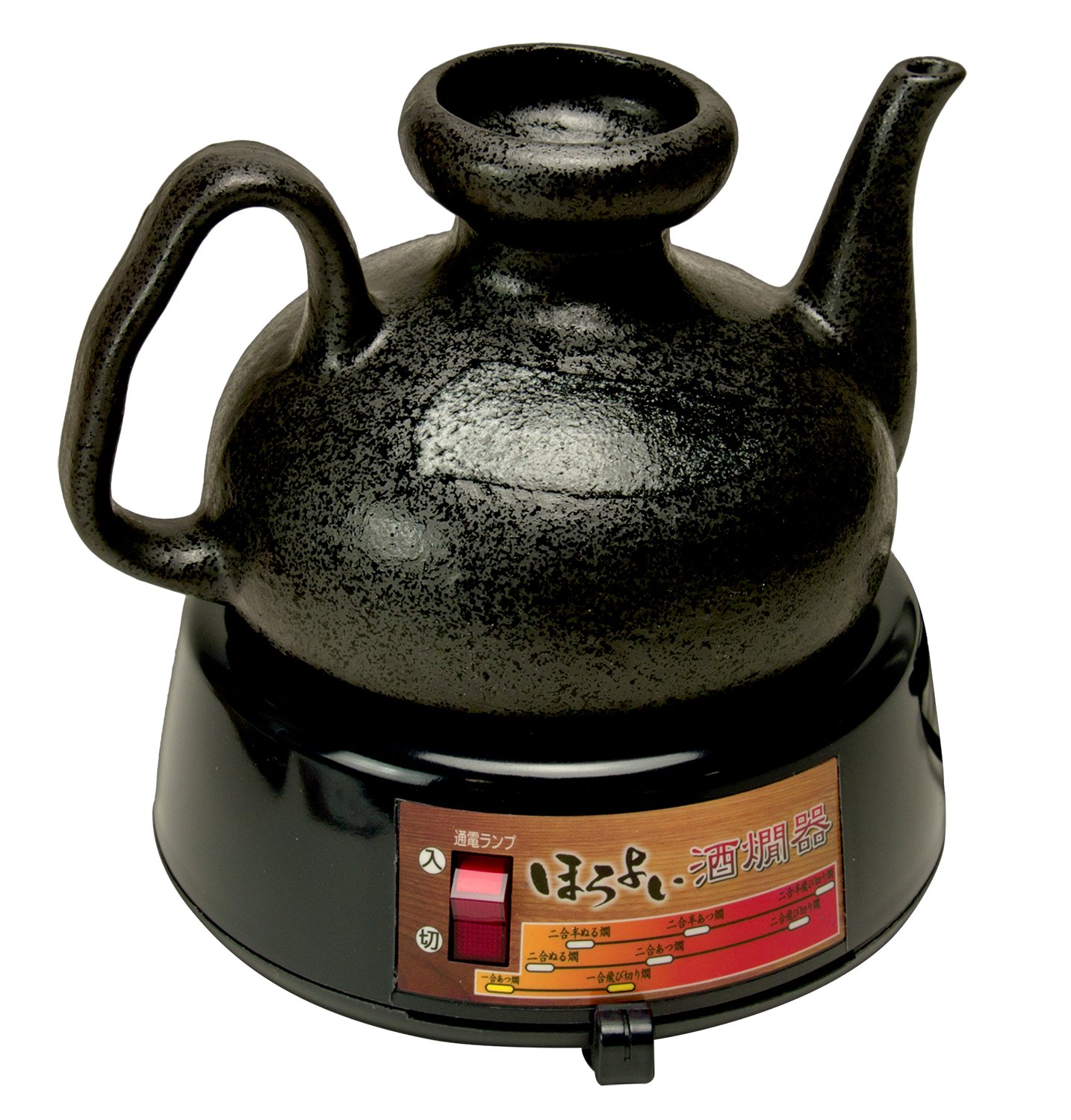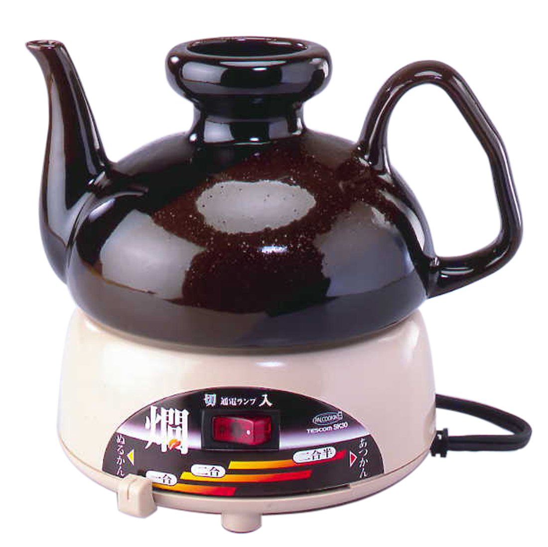 テスコムの酒燗器は、40~50度で温度調節可能な電気式の酒燗器。2.5合の陶磁器の徳利が付いています。