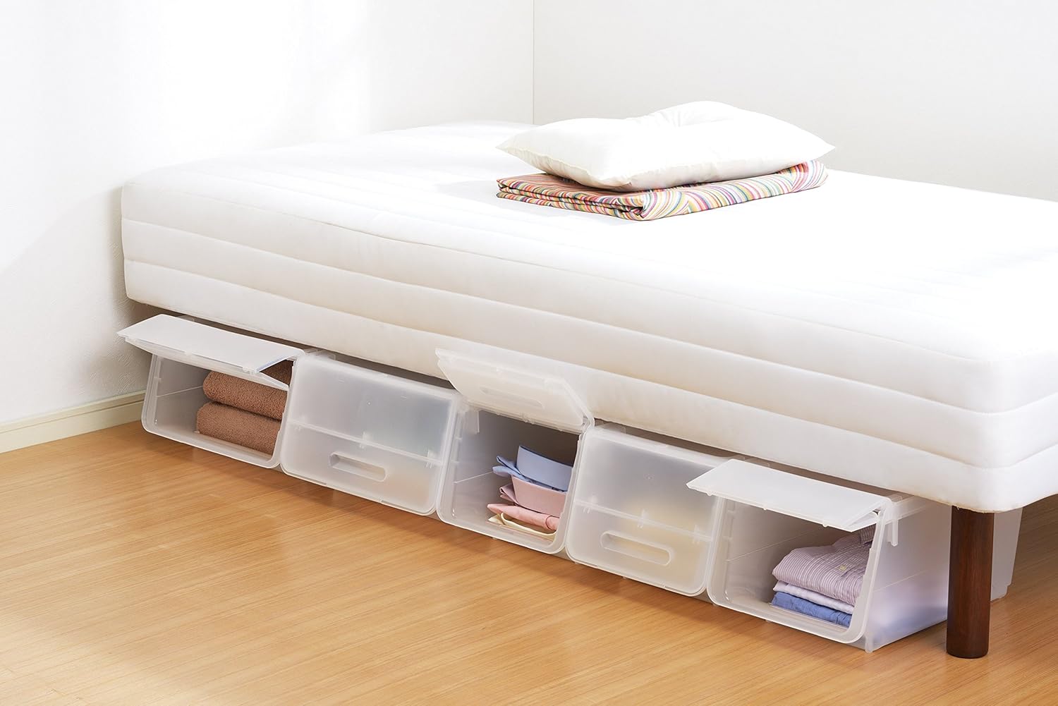 ベッドの下は、収納スペースとして活用できます。ベッドの下に入れる物によっても、ボックスを選ぶ基準は変わるのがポイント。例えば、よく使うものをしまう場合は、出し入れしやすく、中を把握できる口が大きいタイプを。リネン類のストックや、使用頻度の低い物をしまうときは、蓋付きの紙製ボックスが軽くてよいでしょう。ほこりが気になったり、中全体を把握したりしたい場合は、キャスター付きが便利です。