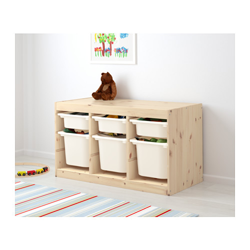 IKEAのTROFAST(トロファスト)シリーズは、パイン材の棚にプラスチック製のボックスを組み合わせた収納棚です。ボックスは軽いので、子どもの力でも楽に運ぶことができます。遊ぶスペースに持って行って使い、その場でササッとお片付けができます。引き出しの深さも選べますし、好みのコンビネーションを選べるところも魅力です。