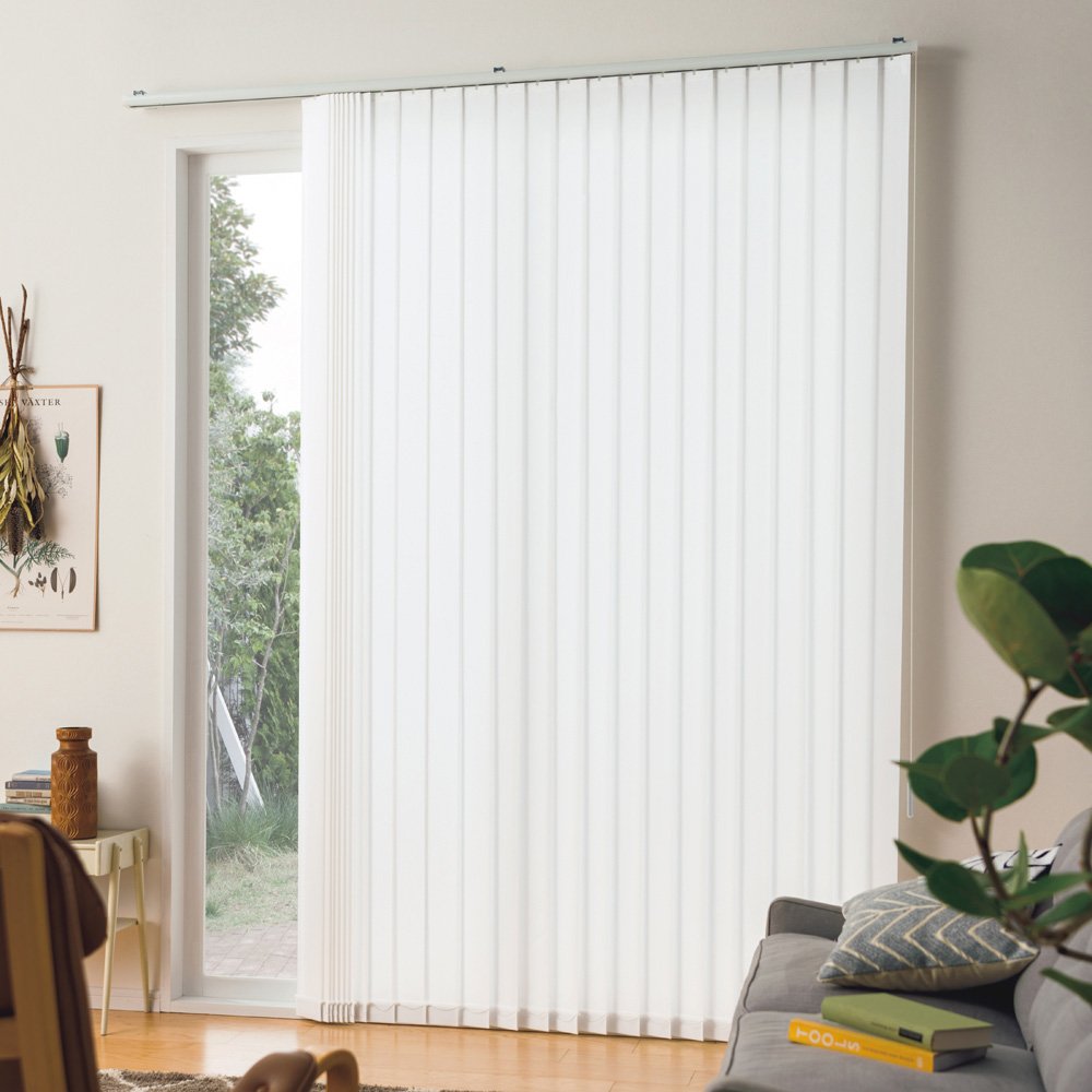 ホワイト調のインテリアはバーチカルブラインドで広々空間を演出