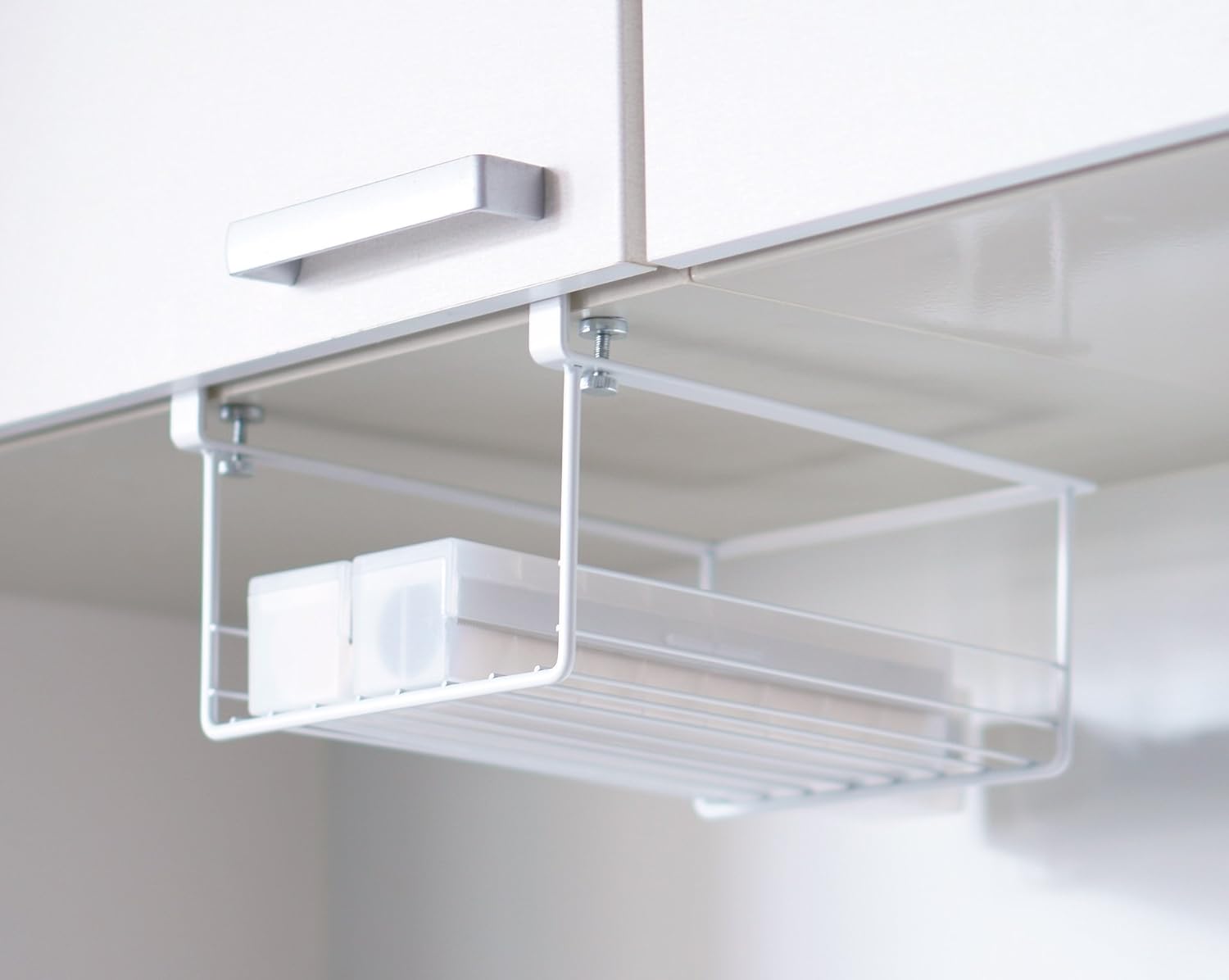 吊戸棚に取り付けるタイプのラックです。ラップやキッチンペーパーなどを収納することができます。ここに収納できればいいのに、といった小さな不満点を解消してくれる収納アイテム。取り付ける場所を選ばないので、使いやすいところに設置できるのも嬉しいですね。