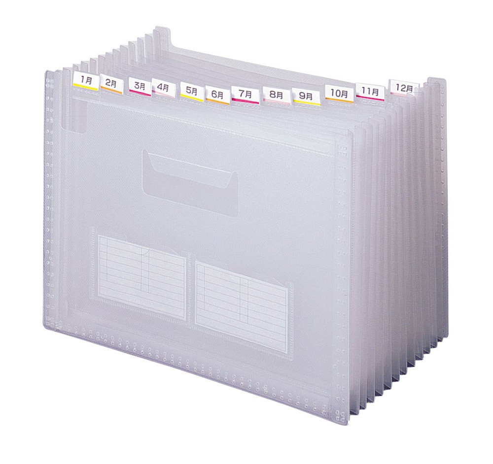 複数のクリアホルダーをまとめて整理できるもの。ラベリングをすることによって、どこに何が入っているかを把握しやすくします。