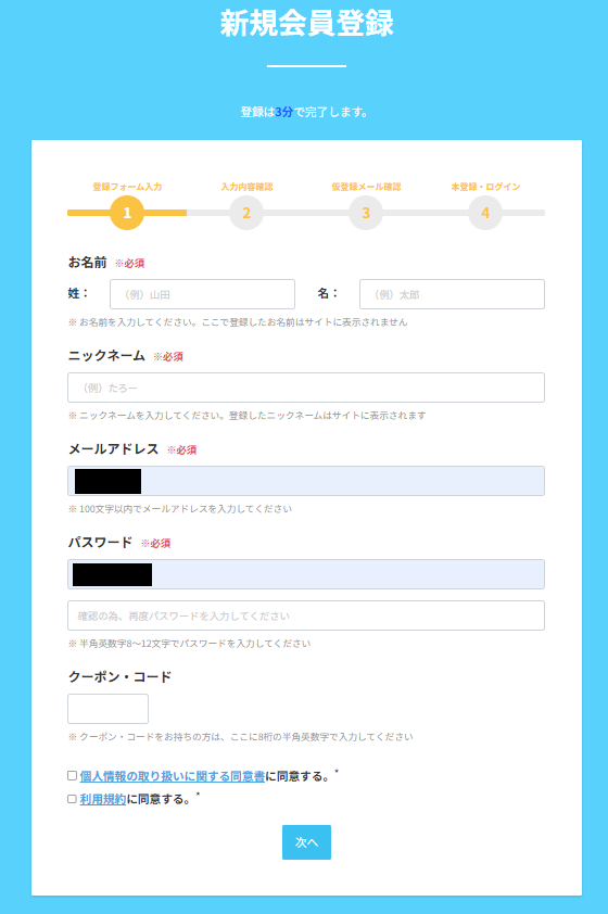 会員登録は無料で、お名前とメールアドレス、パスワードを入力するだけの簡単ステップです。登録は3分ほどで完了し、クレジットカード情報はプランを決めた後にご登録いただけますので、安心してお試しいただけます。