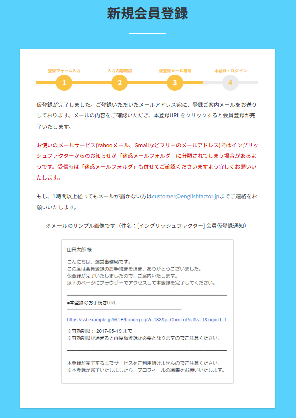 内容を確認していただき、本登録URLをクリックすると会員登録が完了します。
