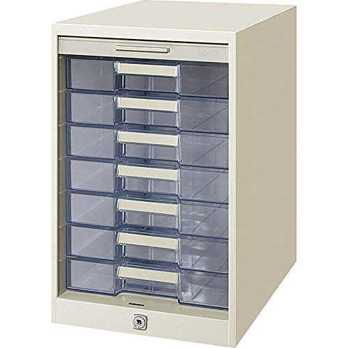 文具メーカーの老舗、コクヨのシャッターケースです。引き出しは透明タイプと、昔ながらのスチールトレイタイプがあります。この製品の特徴は、ケース全体にシャッターを下ろすことができ、カギをかけられるところです。