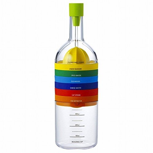 1本で8つのツールがセットになっている便利グッズです。ロートアタッチメント・ロート、キャップオープナー、レモン絞り、計量カップ、玉子つぶし、薬味おろし、チーズ削り、黄身取り、というように料理好きの方に使ってほしい逸品。重ねて収納すると、1本の瓶にまとまって、キッチンに飾っておくだけでもおしゃれです。