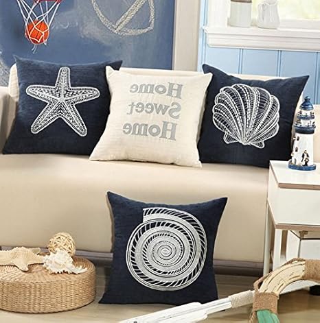 夏といえばやっぱりシェルモチーフ! シェルモチーフだけのクッションだけだと物足りない場合は、写真のような麻素材の白系クッションをアクセントに置くと、ちょうどいい抜け感が出て◎。最近では、夏になると100円ショップにもシェル系モチーフの小物がたくさん出るので、お部屋全体をコーディネートしてもいいですね♪