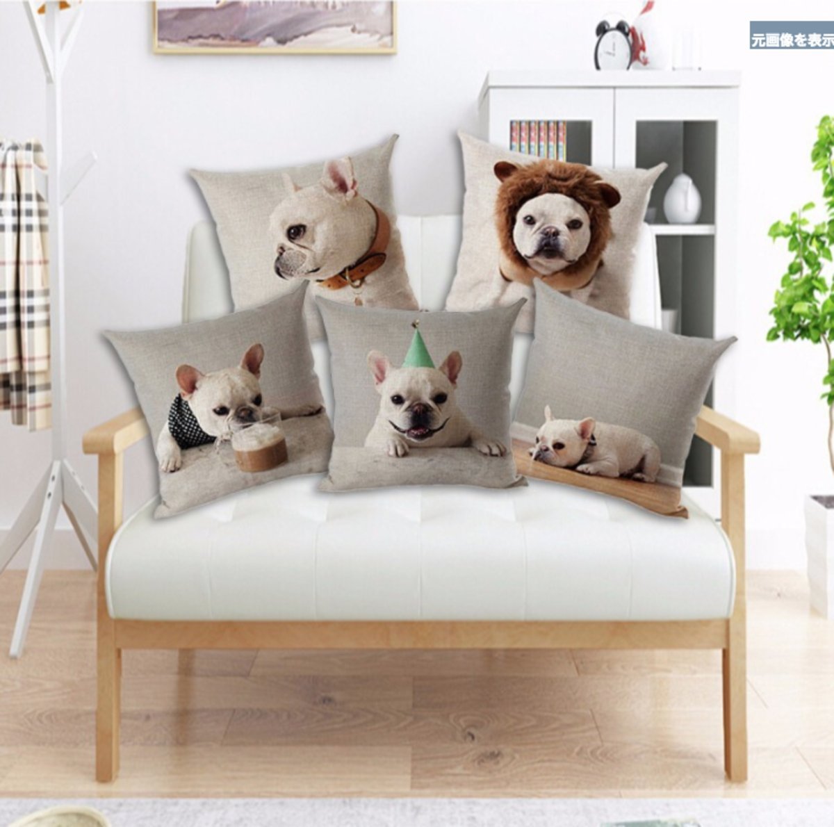 「動物の秋」ということで、クッションカバーもキュートなアニマルモチーフにチェンジ! 思わず頬がにんまりしちゃうフレンチブルドッグがポイント。白ベースや茶色ベースのクッションと組み合わせるといいですね。ウッド系の家具とも相性が良さそう!