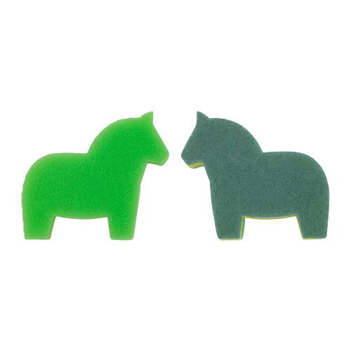 「SNABBAKAT スナッバカート」は、馬のフォルムが印象的なスポンジ。スポンジの素材が表と裏とで違うので、洗うものによって使い分けできます。やわらかい面は軽い汚れや、水分を吸わせるのに便利。粗い面は頑固な汚れの除去に最適です。洗剤の泡立ちもよいので、油汚れもしっかり落とすことができますよ。1ピース79円で、カラーはグリーン/ダークグリーンと、オレンジ/ピンクの2種類がラインナップ。