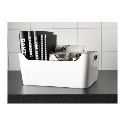 「VARIERA ヴァリエラ」の収納ケースは、手をかけられる穴が両端に付いているから、出し入れや持ち運びがとても簡単。四隅に丸みのあるデザインで、お手入れもしやすい。カラーも白なので、どこでどんな使い方をしてもすっきりとした印象になります。引き出しのなかの仕切りとして使っている人も。再生PET樹脂製なので、水まわりでも活躍してくれますよ。