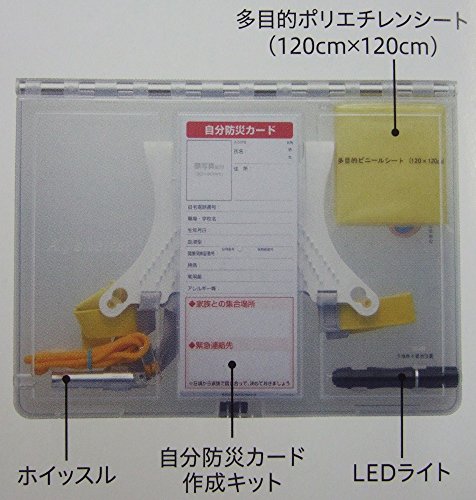 厚さ18mmという極薄の防災セットです。緊急時用のホイッスル、LEDライト、自分防災カードがA4ファイルケースに入っています。