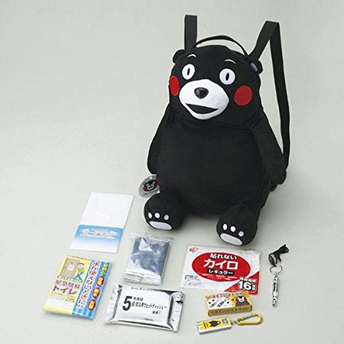 キュートなくまモンの非常用持ち出しリュックです。中身はくまモンのプチライトや防寒シート、カイロ、ウェットティッシュ、簡易トイレなどで、子どもの防災リュックに最適です。