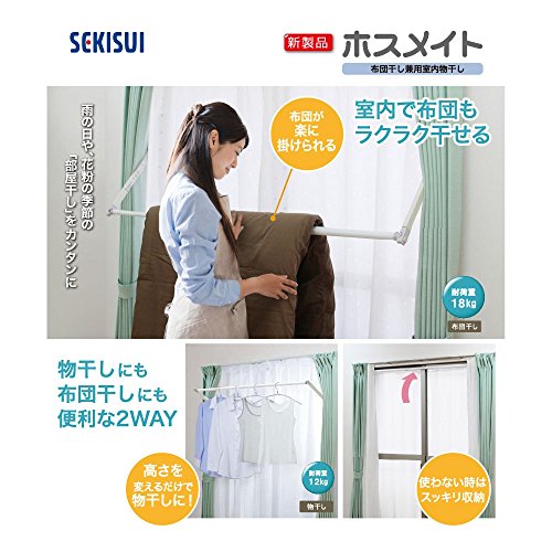 サッシの内枠に、上げ下ろしできるアームをとりつけ、竿を渡して使用します。使わないときは上げておけば目立たず、邪魔にもなりません。カーテンの開閉は普通に行えます。竿は回転するので、布団の取り込みも楽です。耐荷重は18キロなので、普通の布団なら問題ありませんね。