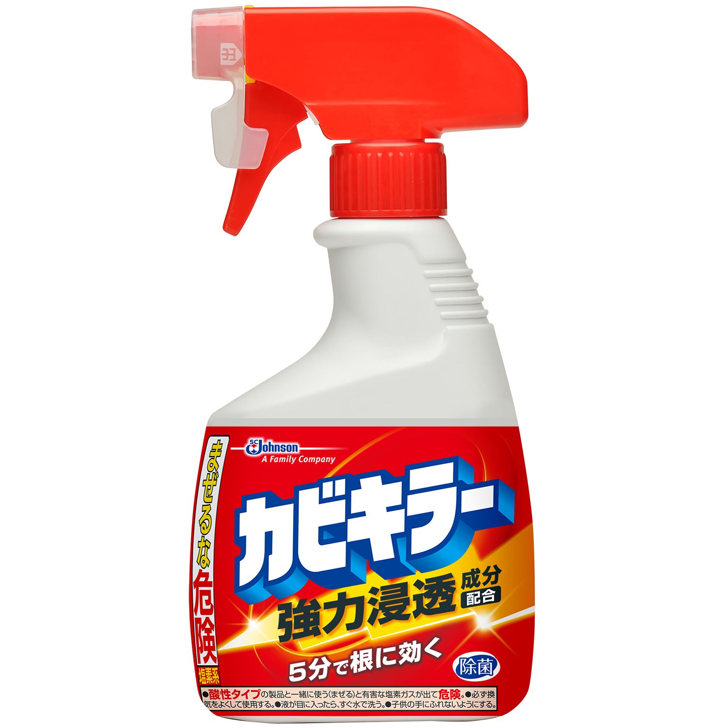 浴室のカビ取り用の塩素系洗剤。カビに直接スプレーして浸透させ、よく洗い流せばOKの手軽さですが、ニオイも洗浄力もかなり強いので、必ず換気して使いましょう。