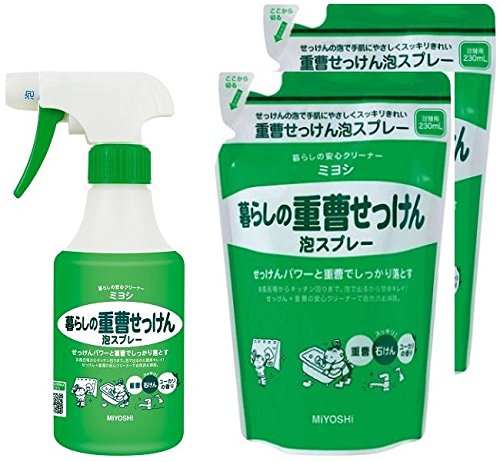 石鹸はアルカリ性なので、一緒に使うと洗浄力が増します。洗濯でも石鹸をお使いの場合は、補助剤として重曹をプラスすると、洗浄力だけでなく除臭効果が期待できます。初めから配合されている重曹石鹸のスプレーも商品化されているので便利。