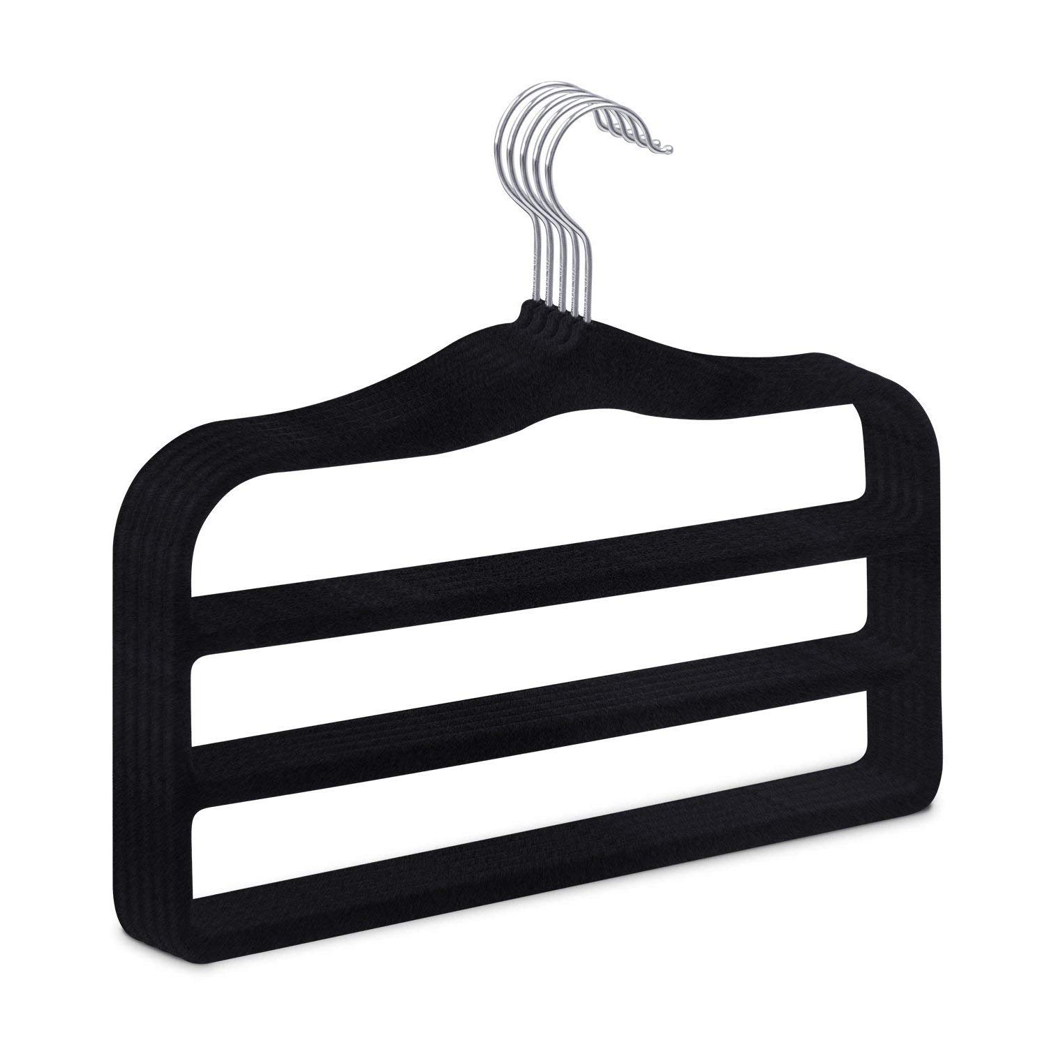 ビロード製のすべらないハンガーです。ひとつに3本のズボンをかけられて、省スペース。重ねたズボンが取り出しにくいという欠点はありますが、シーズンオフの衣類をかけておくには便利です。よく使う物を一番上にかけておく、という工夫もできます。