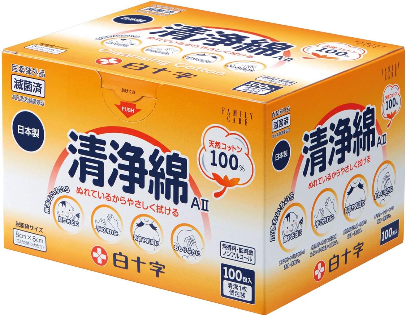 サイズ:8cm×8cm 減菌済で1枚ずつ個包装されている、天然コットン100%の清浄綿です。低刺激・無香料・ノンアルコールなので使いやすくなっています。赤ちゃんのおしりふきなど使いやすいサイズ。30包入のタイプもあるので、試してみてからこちらの大容量タイプを購入するのもおすすめです。